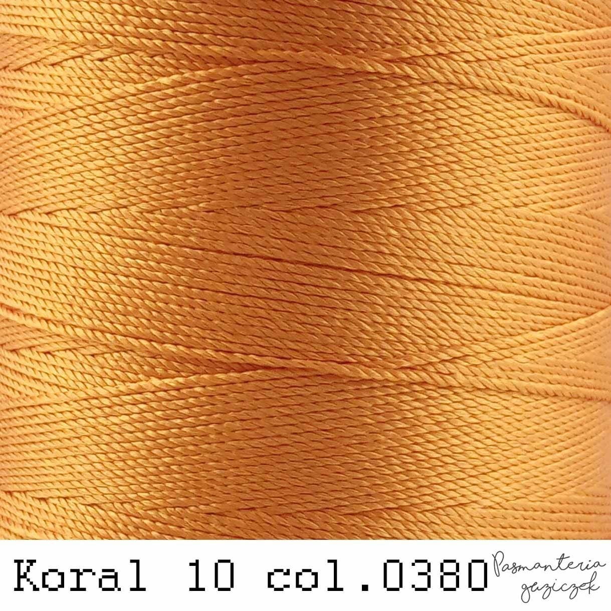 Nici zdobnicze Koral 10 - błyszczące nici wykonane z poliestru, dzięki ładnemu splotowi nitki rzeczy z nich wykonane wyróżniają się ładną dekoracyjną strukturą. Nadaja się na obrusy, bieżniki, serwetki,a nawet na bluzeczki, kapelusze czy torebki.