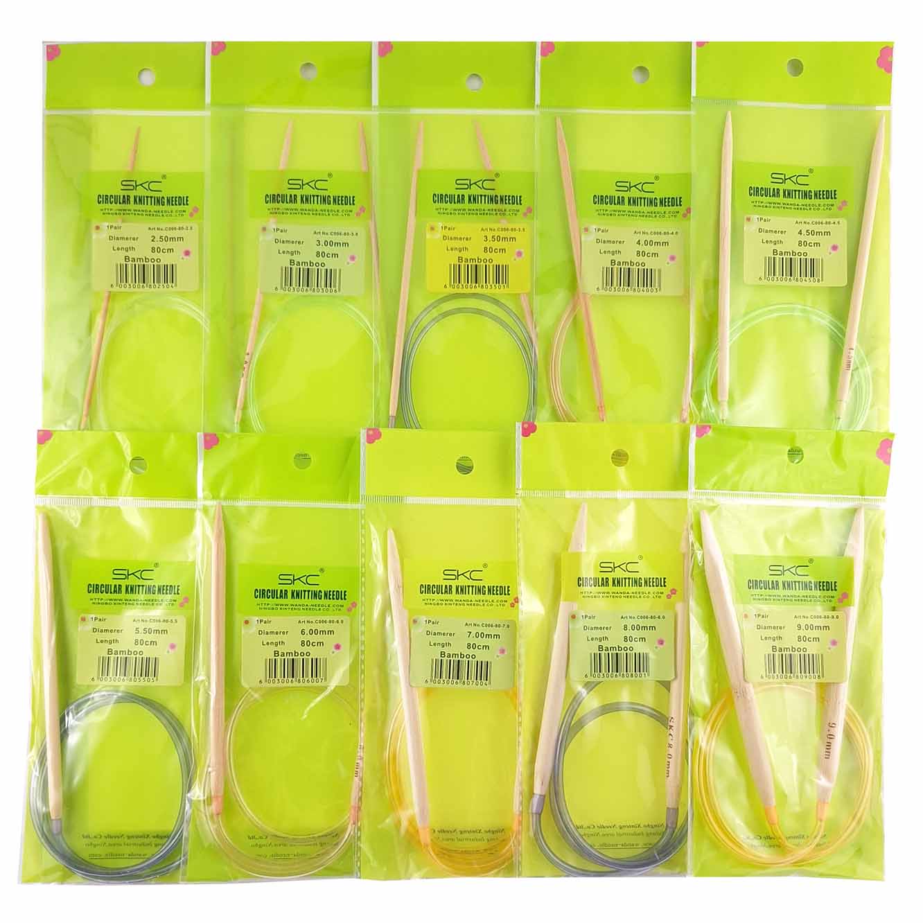 Druty SKC - bambusowe druty na żyłce, długość całkowita 80 cm, na każdym drucie znajduje się wypalony rozmiar.