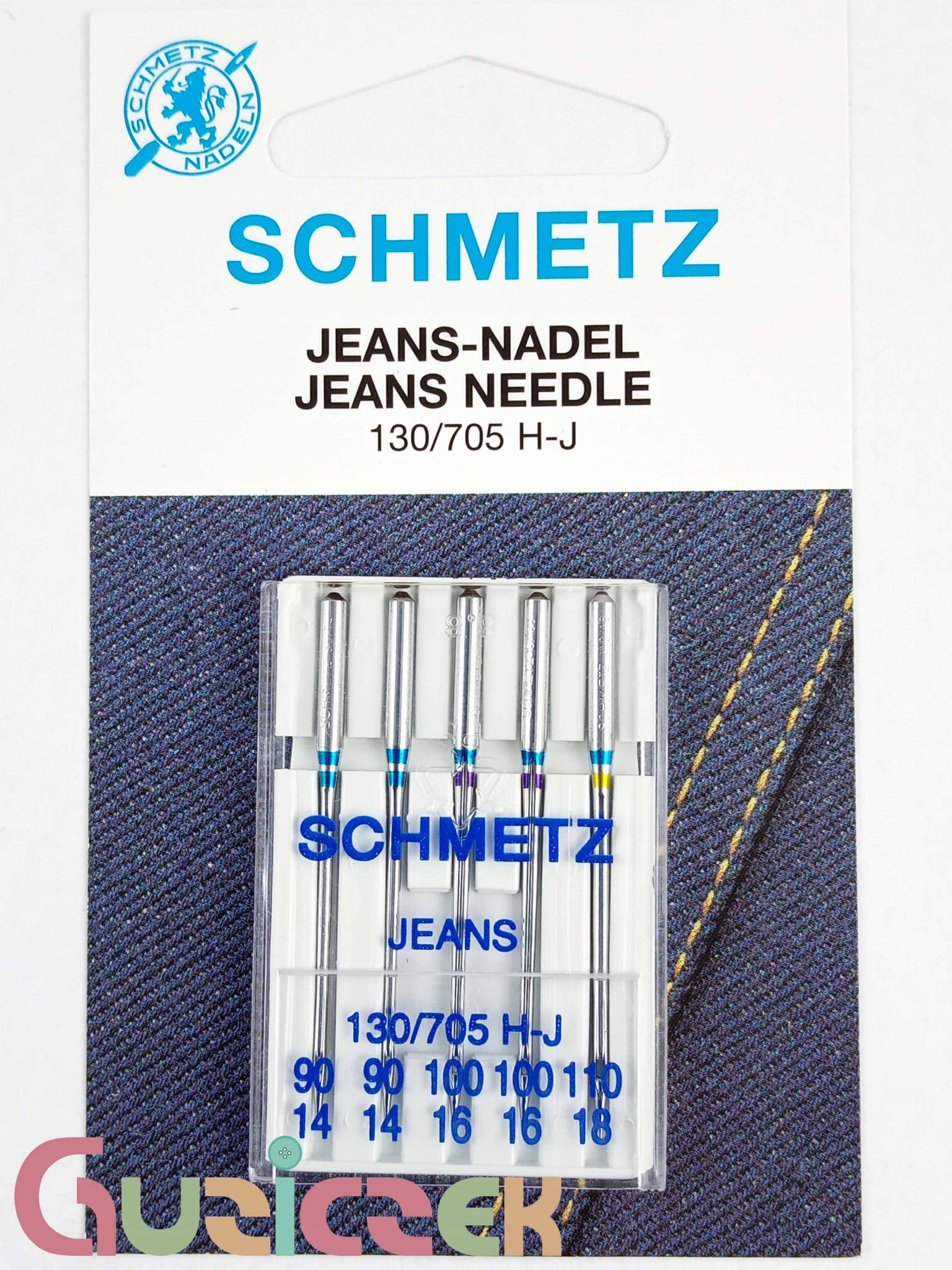 Igły do maszyn domowych Schmetz (130/705 H-J) - zestaw 5 igieł do dżinsu, renomowanej niemieckiej firmy Schmetz, przeznaczone do szycia jeansu (denimu), skaju, folii, ceraty oraz grubych tkanin. W celu łatwiejszego rozpoznania igły oznaczone są kolorem niebieskim. Pasują do większości typów domowych maszyn do szycia.