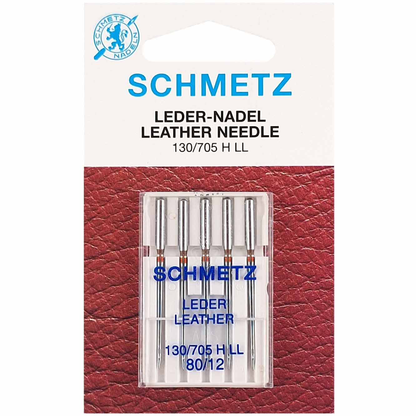 Igły do maszyn domowych Schmetz (130/705 H LL) - zestaw 5 igieł z tnącym ostrzem, renomowanej niemieckiej firmy Schmetz, przeznaczone do szycia skóry. Pasują do większości typów domowych maszyn do szycia.
