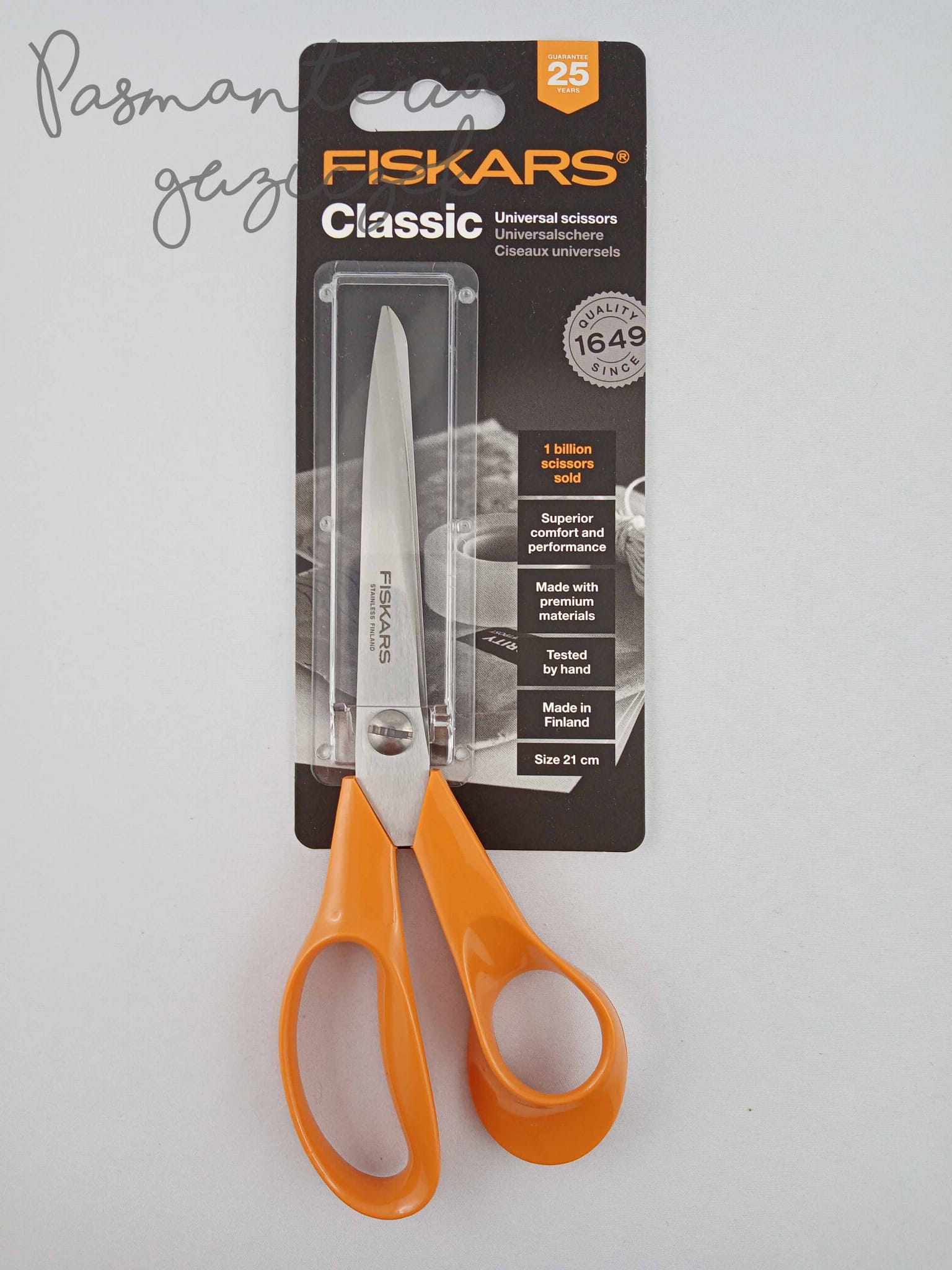 Nożyczki uniwersalne - bardzo ostre i niezawodne nożyczki renomowanej marki Fiskars, nożyczki sprawdzą się także przy cięciu lekkich tkanin takich jak podszewki, szyfony, ortaliony, cienkie dresówki itp. a także do przycinania makramy.