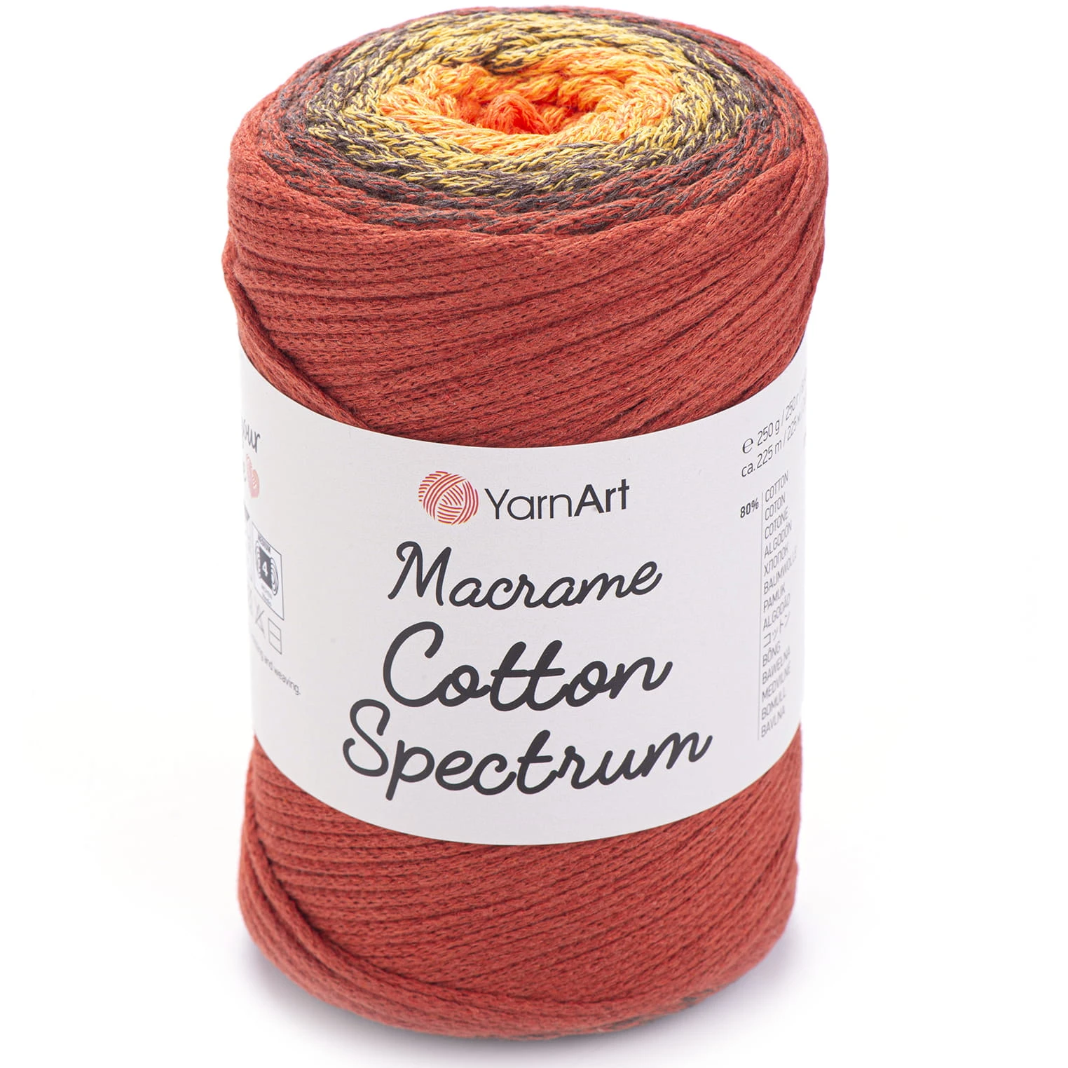 Sznurek bawełniany YarnArt macrame cotton spectrum - miękki i delikatny pleciony sznurek ombre bez rdzenia, nie ślizga się przez co jest łatwy w wiązaniu w technice makramowej. Polecany przy wyrobach typu torebki, siatki, poduszki, pledy, makramy. Grubość sznurka ok. 1,5 - 2 mm.