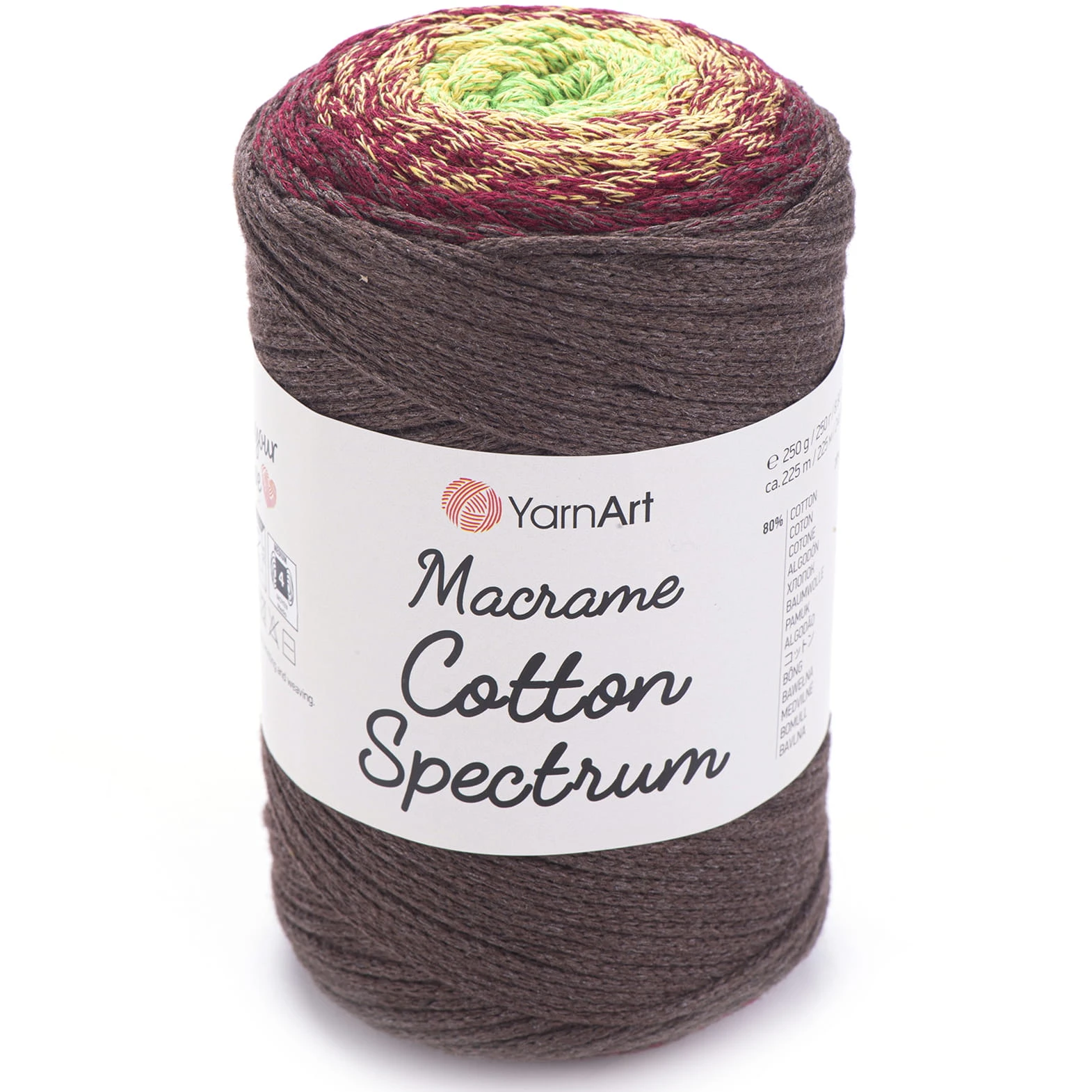 Sznurek bawełniany YarnArt macrame cotton spectrum - miękki i delikatny pleciony sznurek ombre bez rdzenia, nie ślizga się przez co jest łatwy w wiązaniu w technice makramowej. Polecany przy wyrobach typu torebki, siatki, poduszki, pledy, makramy. Grubość sznurka ok. 1,5 - 2 mm.