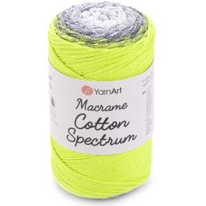 Sznurek bawełniany YarnArt macrame cotton spectrum - miękki i delikatny pleciony sznurek ombre bez rdzenia, nie ślizga się przez co jest łatwy w wiązaniu w technice makramowej. Polecany przy wyrobach typu torebki, siatki, poduszki, pledy, makramy. Grubość sznurka ok. 1,5 - 2 mm.
