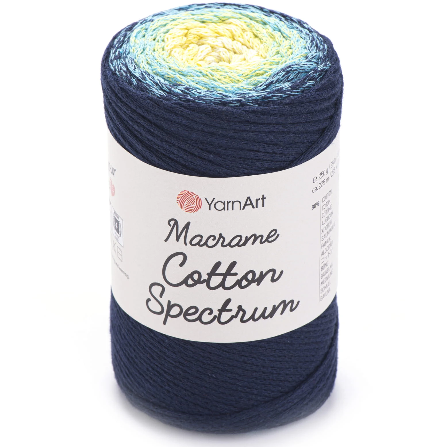 Sznurek bawełniany YarnArt macrame cotton spectrum - miękki i delikatny pleciony sznurek ombre bez rdzenia, nie ślizga się przez co jest łatwy w wiązaniu w technice makramowej. Polecany przy wyrobach typu torebki, siatki, poduszki, pledy, makramy. Grubość sznurka ok. 1,5 - 2 mm.
