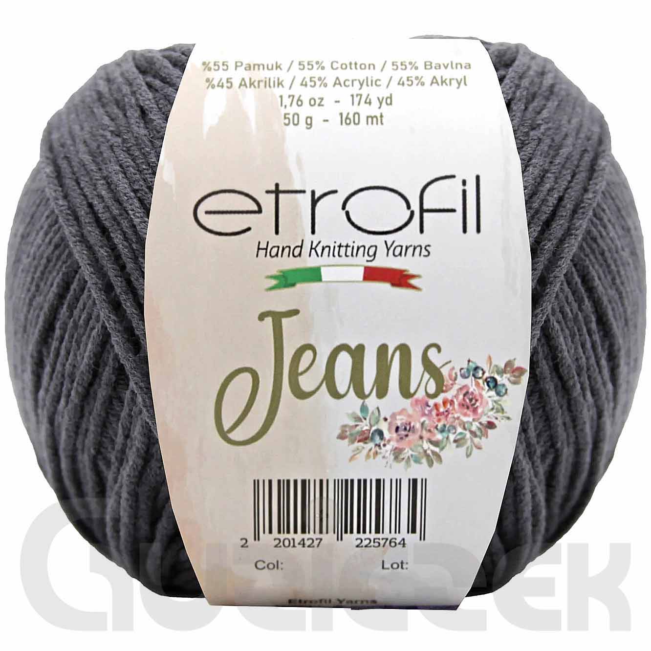 Włóczka Etrofil Jeans - to połączenie bawełny i akrylu, które nadaje dzianinie miękkość i elastyczność, dzięki zawartości bawełny włóczka zapewnia komfort oraz oddychającą strukturę, a dzięki zawartości akrylu ułatwia uzyskanie lżejszych, mocniejszych i ponadczasowych produktów. To kłębek o bardzo szerokim zastosowaniu, który sprawdzi się o każdej porze roku. Dzięki dużej gamie kolorystycznej możesz dziergać takie rzeczy jak letnie sukienki, pareo, bluzki, wiosenne kardigany i kamizelki. Nadaje się także do projektów takich jak ubranka dla dzieci, kocyki, zabawki, akcesoria, torby, haft i poduszki.