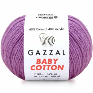 Włóczka Gazzal Baby Cotton - mieszanka bawełny z akrylem. Bardzo delikatna, miękka kompozycja idealna dla dzieci oraz osób wrażliwych. Średniej grubości włóczka sprawdzi się na różnego rodzaju wyroby dziewiarskie od swetrów, kamizelek, czapek, szalików po ciepłe kocyki dla dzieci oraz zabawki.
