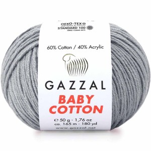 Włóczka Gazzal Baby Cotton - mieszanka bawełny z akrylem. Bardzo delikatna, miękka kompozycja idealna dla dzieci oraz osób wrażliwych. Średniej grubości włóczka sprawdzi się na różnego rodzaju wyroby dziewiarskie od swetrów, kamizelek, czapek, szalików po ciepłe kocyki dla dzieci oraz zabawki.
