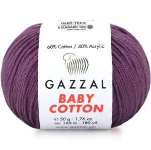 Włóczka Gazzal Baby Cotton - mieszanka bawełny z akrylem. Bardzo delikatna, miękka kompozycja idealna dla dzieci oraz osób wrażliwych. Średniej grubości włóczka sprawdzi się na różnego rodzaju wyroby dziewiarskie od swetrów, kamizelek, czapek, szalików po ciepłe kocyki dla dzieci oraz zabawki.