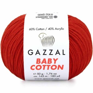 Włóczka Gazzal Baby Cotton - mieszanka bawełny z akrylem. Bardzo delikatna, miękka kompozycja idealna dla dzieci oraz osób wrażliwych. Średniej grubości włóczka sprawdzi się na różnego rodzaju wyroby dziewiarskie od swetrów, kamizelek, czapek, szalików po ciepłe kocyki dla dzieci oraz zabawki.