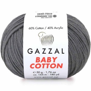 Włóczka Gazzal Baby Cotton - mieszanka bawełny z akrylem. Bardzo delikatna, miękka kompozycja idealna dla dzieci oraz osób wrażliwych. Średniej grubości włóczka sprawdzi się na różnego rodzaju wyroby dziewiarskie od swetrów, kamizelek, czapek, szalików po ciepłe kocyki dla dzieci oraz zabawki.