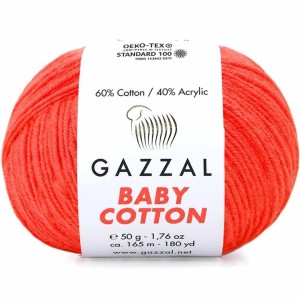 Włóczka Gazzal Baby Cotton - mieszanka bawełny z akrylem. Bardzo delikatna, miękka kompozycja idealna dla dzieci oraz osób wrażliwych. Średniej grubości włóczka sprawdzi się na różnego rodzaju wyroby dziewiarskie od swetrów, kamizelek, czapek, szalików po ciepłe kocyki dla dzieci oraz zabawki.