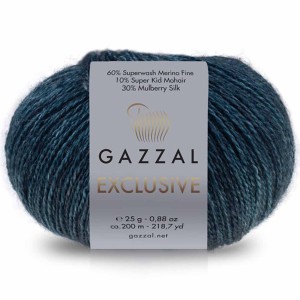 Włóczka Gazzal Exclusive - to luksusowa włóczka łącząca naturalny jedwab z delikatnym moherem oraz wysokiej jakości wełną merynosa Superwash. Połączenie to sprawia, że przędza jest miękka, delikatna, przyjemna w dotyku, nie podrażnia, jest ciepła oraz przewiewna. Polecana dla najdelikatniejszej skóry alergicznej, a także dla dzieci. Sprawdzi się w zwiewnych, lekkich i eleganckich wyrobach takich jak sweterki, szale, chusty czy narzutki.