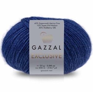 Włóczka Gazzal Exclusive - to luksusowa włóczka łącząca naturalny jedwab z delikatnym moherem oraz wysokiej jakości wełną merynosa Superwash. Połączenie to sprawia, że przędza jest miękka, delikatna, przyjemna w dotyku, nie podrażnia, jest ciepła oraz przewiewna. Polecana dla najdelikatniejszej skóry alergicznej, a także dla dzieci. Sprawdzi się w zwiewnych, lekkich i eleganckich wyrobach takich jak sweterki, szale, chusty czy narzutki.