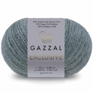 Włóczka Gazzal Exclusive - to luksusowa włóczka łącząca naturalny jedwab z delikatnym moherem oraz wysokiej jakości wełną merynosa Superwash. Połączenie to sprawia, że przędza jest miękka, delikatna, przyjemna w dotyku, nie podrażnia, jest ciepła oraz przewiewna. Polecana dla najdelikatniejszej skóry alergicznej, a także dla dzieci. Sprawdzi się w zwiewnych, lekkich i eleganckich wyrobach takich jak sweterki, szale, chusty czy narzutki.