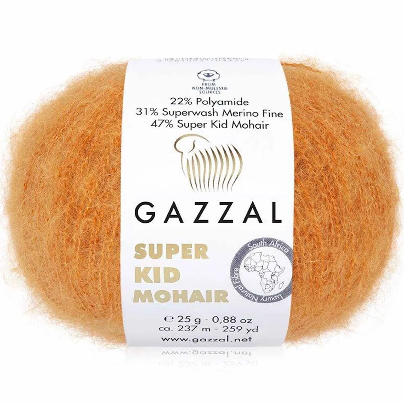 Włóczka Gazzal Super Kid Mohair - połączenie wełny merynosa z moherem sprawia, że włóczka ta jest wyjątkowo puszysta i przyjemna w dotyku. Nitka jest cienka, włochata przy czym bardzo wydajna. Sprawdzi się zarówno samodzielnie do wyrobów takich jak chusty, szaliki, swetry typu chmurka, a także jako dodatkowa włochata nitka nadająca puszystość grubszym włóczkom.