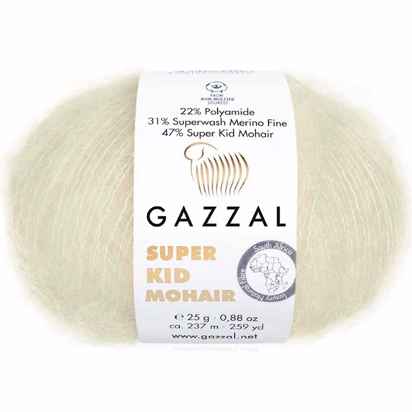 Włóczka Gazzal Super Kid Mohair - połączenie wełny merynosa z moherem sprawia, że włóczka ta jest wyjątkowo puszysta i przyjemna w dotyku. Nitka jest cienka, włochata przy czym bardzo wydajna. Sprawdzi się zarówno samodzielnie do wyrobów takich jak chusty, szaliki, swetry typu chmurka, a także jako dodatkowa włochata nitka nadająca puszystość grubszym włóczkom.