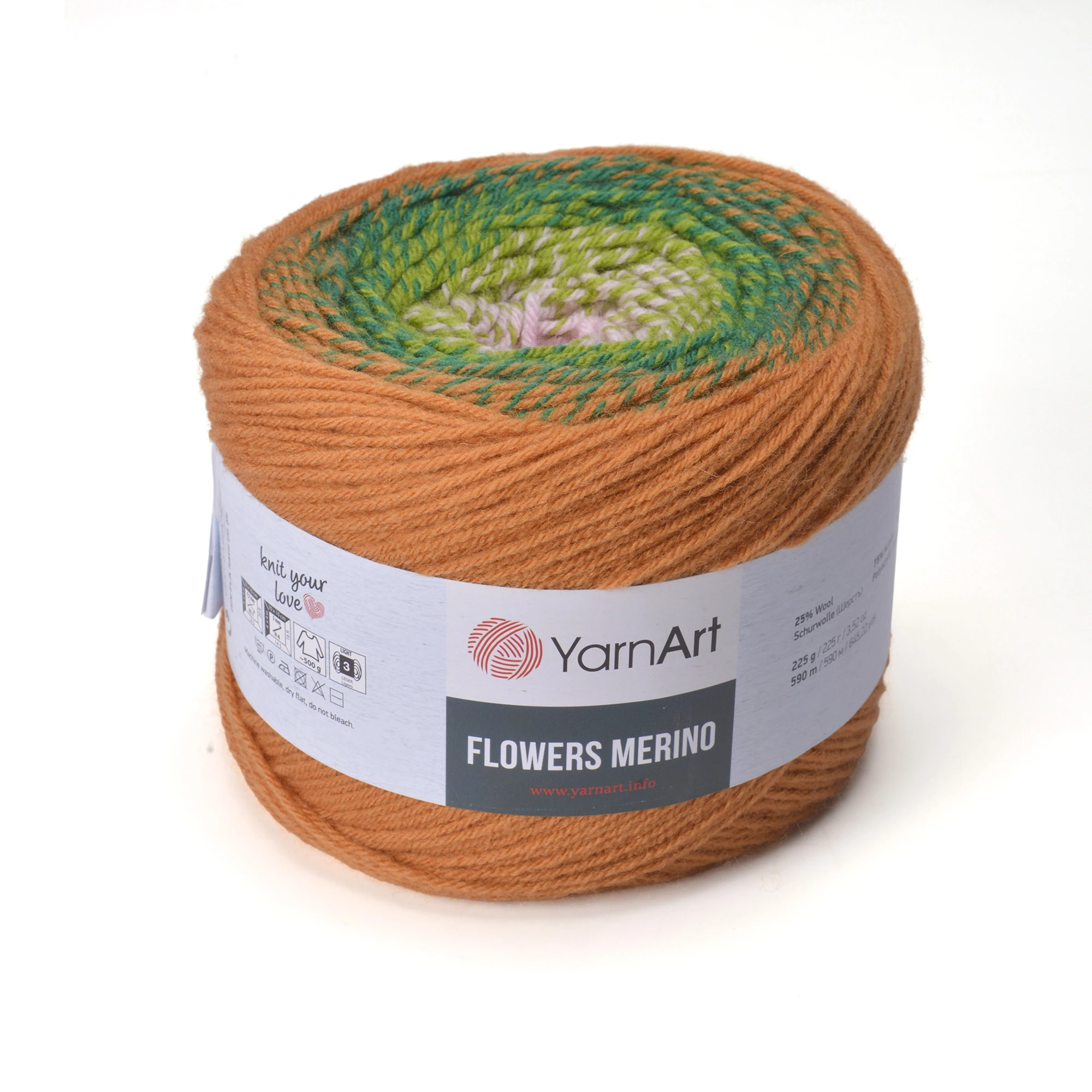 Włóczka YarnArt Flowers Merino - włóczka ombre składające się z czterech skręconych nitek dzięki czemu kolory płynnie przechodzą jeden w drugi. Dodatek wełny oraz grubsza nitka sprawiają, że włóczka ta sprawdzi się przy wyrobie zimowych chust, kominów czy szalików.