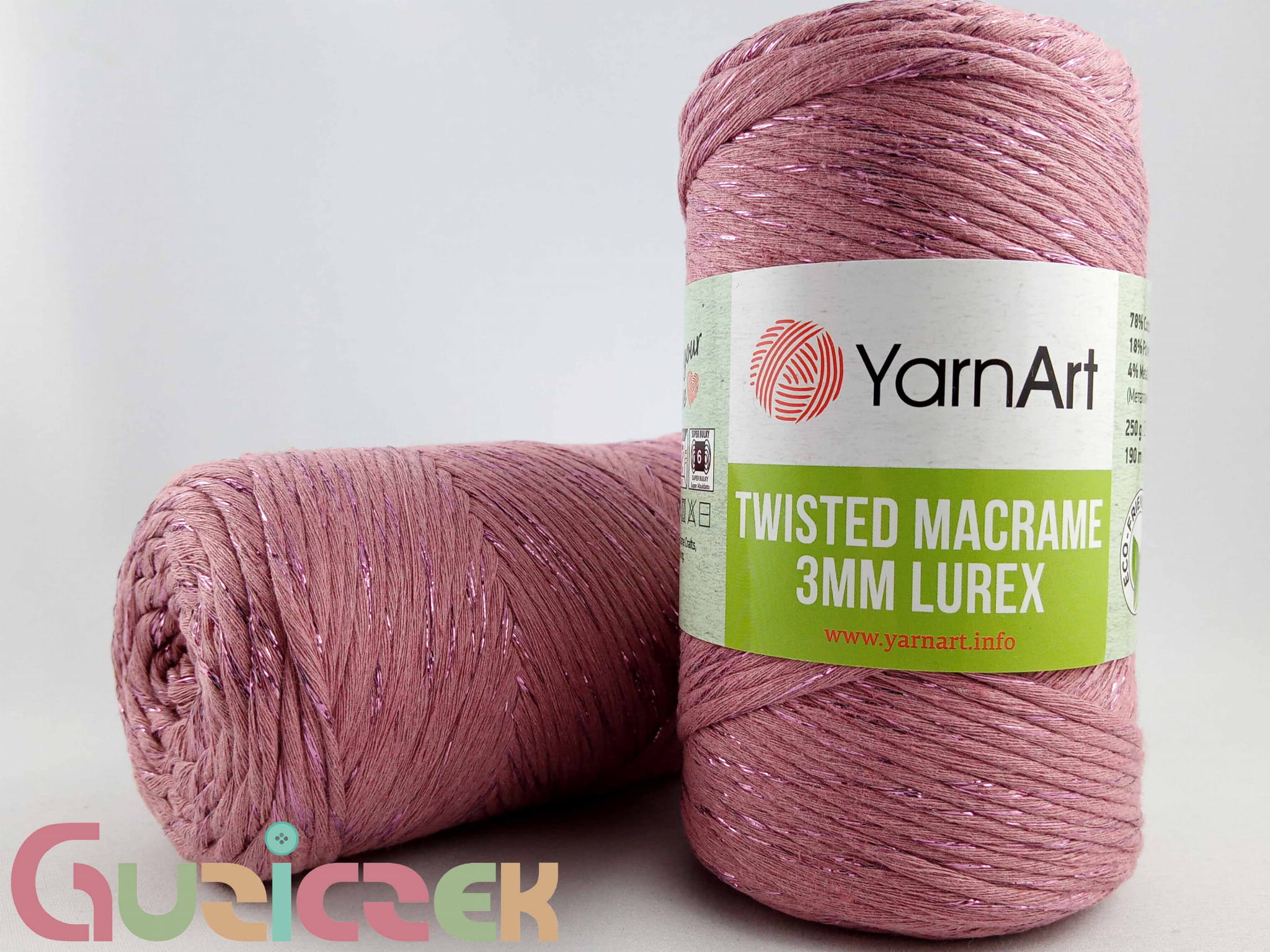 Sznurek bawełniany YarnArt twisted macrame lurex 3mm - pojedynczo skręcany bawełniano-poliestrowy sznurek z metalizowaną błyszczącą nitką. Sznurki skręcane nie posiadają rdzenia dzięki czemu są delikatniejsze i miększe, a prace z niego wykonane są lżejsze. Polecany przy wyrobach typu torebki, makramy. Sznurek można rozczesywać.